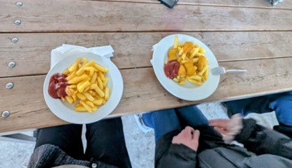Nach einiger Zeit haben wir eine Pause gemacht. In der Pause haben wir etwas gegessen: Pommes mit Chicken Nuggets und Ketchup. Das hat nach dem Eislaufen besonders gut geschmeckt.