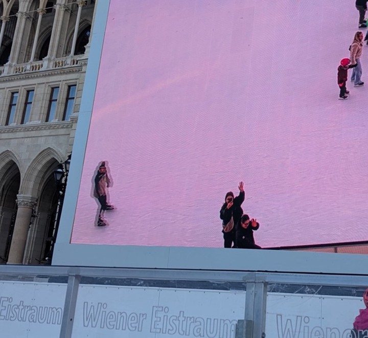 Auf einem großen Bildschirm konnten wir uns sogar selbst beim Eislaufen sehen. Das war lustig und wir konnten uns selbst zuwinken.