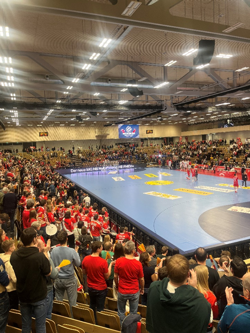 In der Halle lagen an allen Stühlen Fächer aus Pappe. Damit kann man im Spiel viel Lärm machen. Ein Moderator und DJ haben für gute Stimmung gesorgt. Über Kameras konnte man Fans auf großen Bildschirmen sehen. Wir haben gehofft, dass wir auch im Fernsehen zu sehen sind. Doch das ist leider nicht passiert ☹.